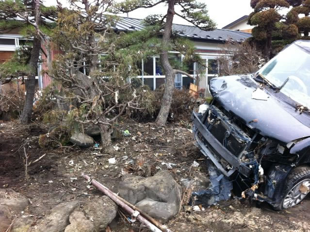 庭と車。表面には収縮して2cmぐらいのヘドロ塩分がすごい 手つかずのまま