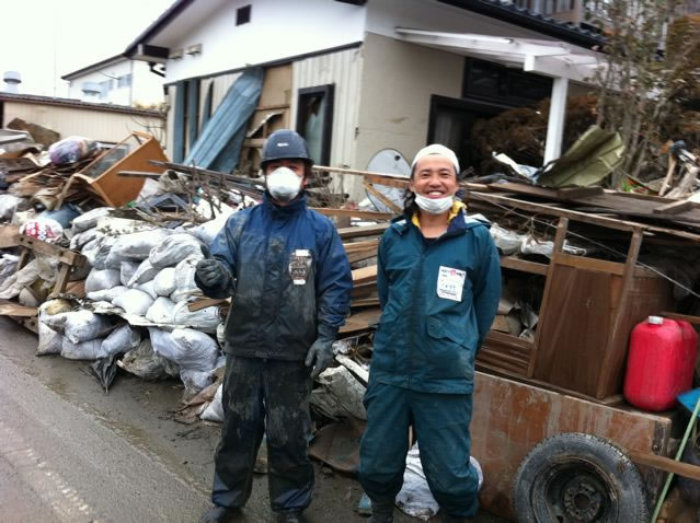 埼玉越谷から駆けつけたイベント会社経営のボランティアさんと。後ろの家はまだ何も手を付けられていない